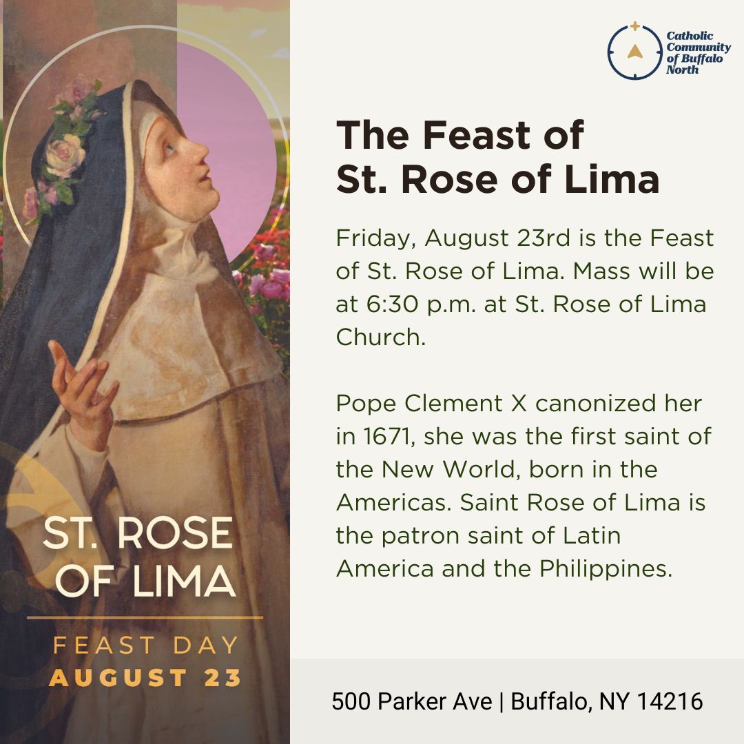 Friday, August 23rd is the Feast of St. Rose of Lima. Mass will be at 6:30 p.m. at St. Rose of Lima Church.